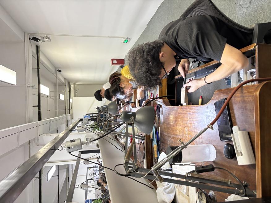 在深圳誉宝集团巨匠黄金工坊,教师团队实地观察了打金、錾刻、拉丝等工艺的生产流程,企业经理李总介绍,巨匠黄金工坊是一群由金工国家队组成的手工坊,我们首饰设计专业有2名同学在这里继续锻炼成长。企业安排资深技师带教,学校则根据企业需求调整专业课程的内容和实操课时,确保学生实习时能快速上手,同时企业给实习学生明确的职业规划从学徒到初级师傅、中级师傅,再到高级师傅。