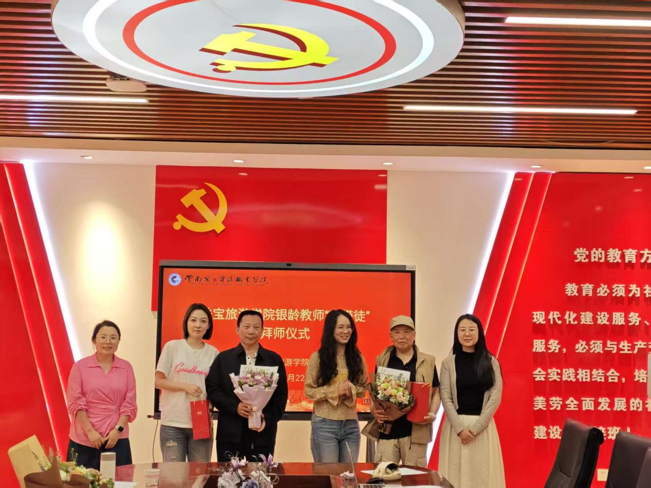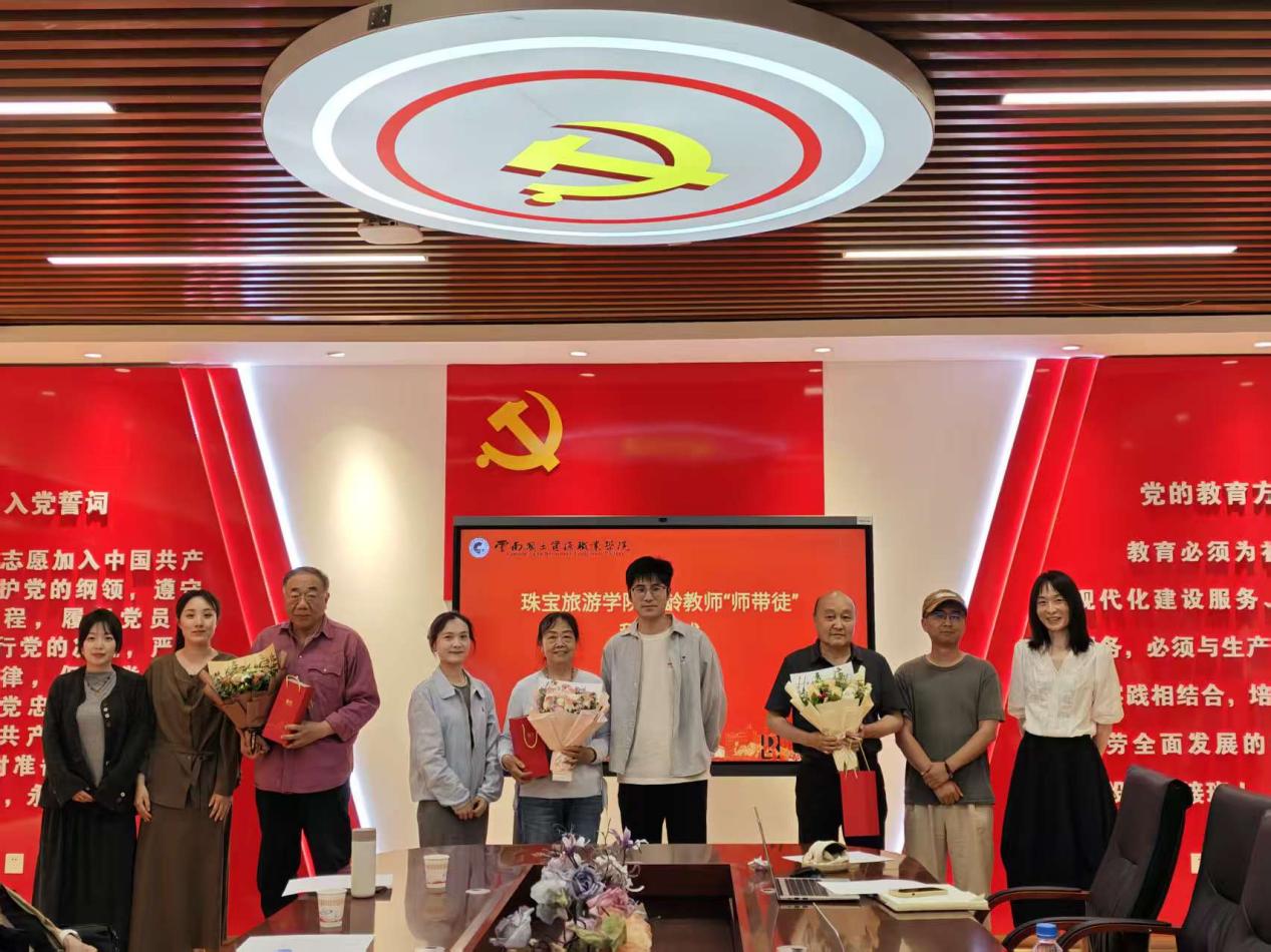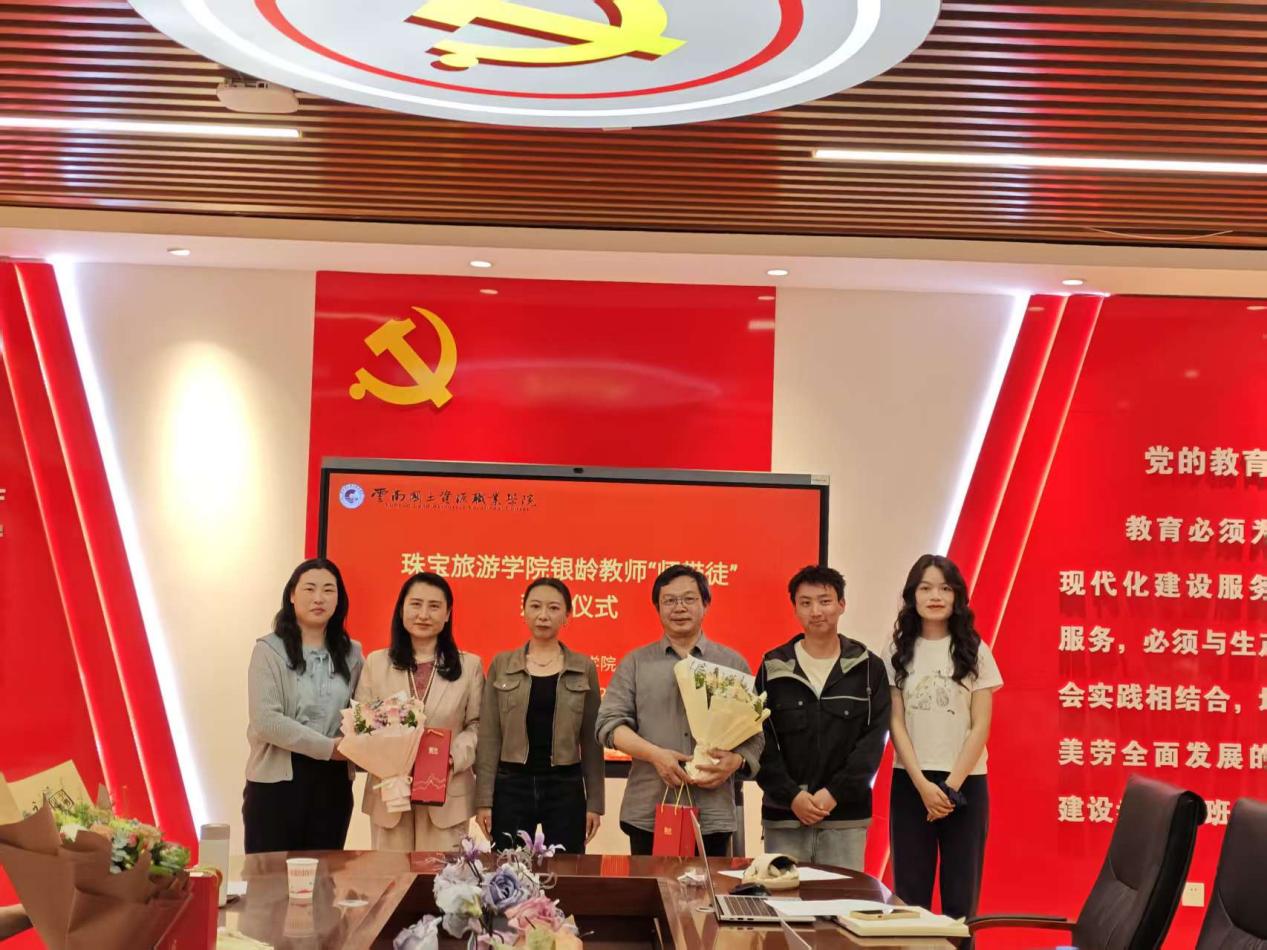 4 月 22 日,珠宝旅游学院在勘物楼 A303 党建室举行以 “凝聚银龄智慧,赋能学院发展” 为主题的银龄教师 “师带徒” 拜师仪式。学院领导班子、7 位银龄教师、各教研室主任、专业带头人及 14 名青年教师参会,仪式由学院副院长陈雨帆主持。